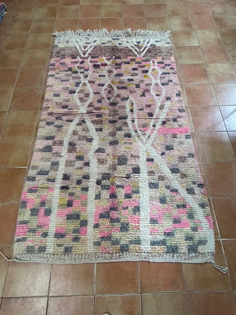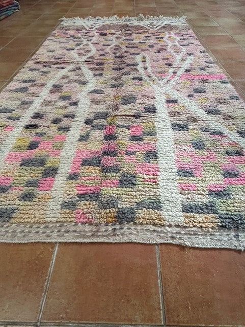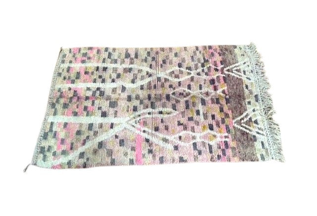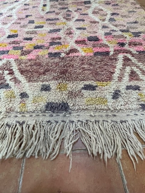 Unser einzigartiger Boujaad-Teppich ist ein echtes Kunstwerk aus Marokko und bringt mit seiner harmonischen Farbpalette Wärme und Charakter in jedes Zuhause. In liebevoller Handarbeit gefertigt, vereint dieser Teppich zarte Rosatöne, edles Altrosa, sanftes Schwarz, warmes Senfgelb, dezentes Olivgrün und weiche Braunnuancen. Naturweiße Linien durchziehen das Design und enden in einem charmanten, dezenten Kettenmuster, das den authentischen Boho-Charme unterstreicht.