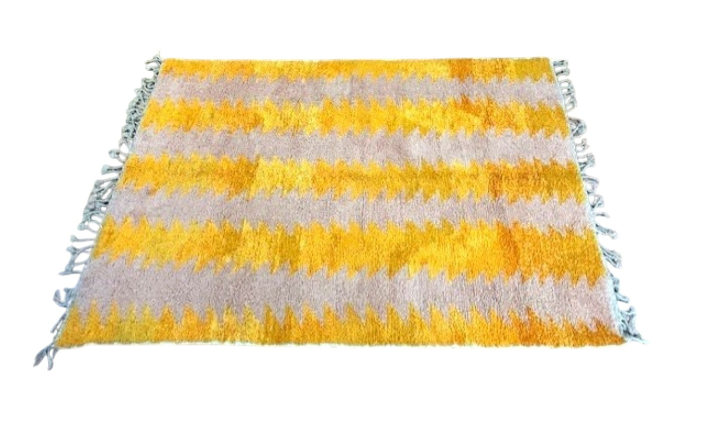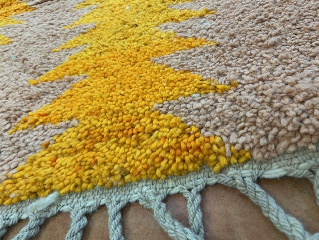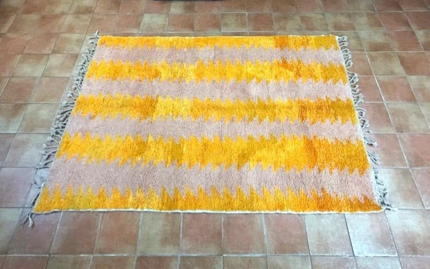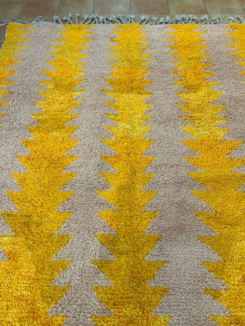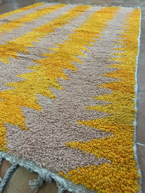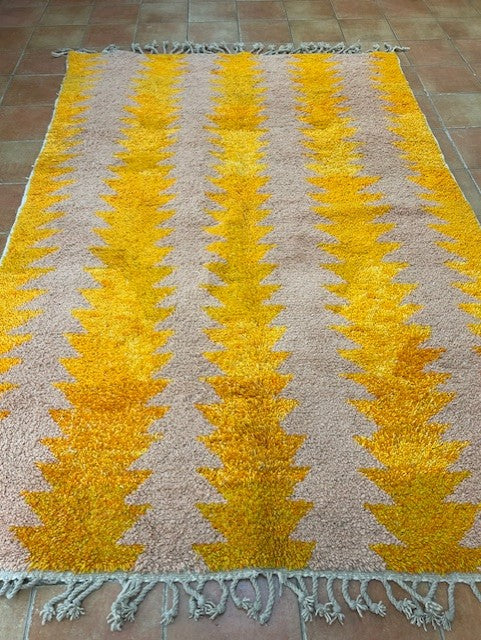Dieser wunderschöne Beni Ourain Teppich in der Größe 300x200 cm besticht durch sein einzigartiges, verspieltes Streifenmuster in sanften Tönen von altrosa und senfgelb, die sich leicht in ein zartes Orange verwandeln. Das harmonische Farbspiel sorgt für eine warme, einladende Atmosphäre in jedem Raum und ist ein wahrer Blickfang.
